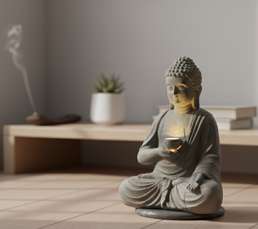 Esta escultura de Buda com luz solar é perfeita para ambientes externos, como jardins, varandas e pátios.